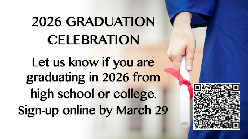 We will be recognizing graduates on Sunday, April 12, during the morning worship service. If you are part of our EBC family and graduating in 2026 from high school, college, or vocational school, -> Please Sign-up here <-. Paperwork and photos must be submitted by Sunday, March 29. Contact the Church Office at 473-4004, ext. 0 for more information. ““CONGRATULATIONS 2026 Graduates!”