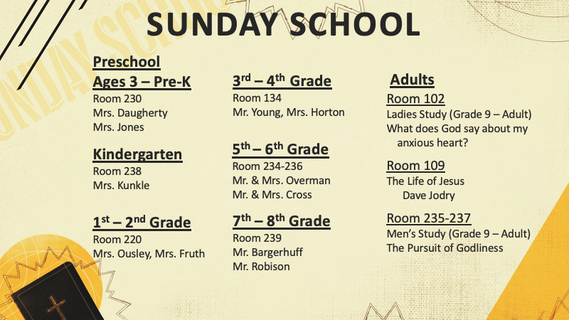 EBC SUNDAY SCHOOL Grades 7th & 8th, EBC Room 239 Date April 19, 2026 Every Week Time 9:14 am – 10:15 am Grades 7 & 8, EBC Room 239 Address 1540 E. Paw Paw Pike Peru IN 46970 Directions Venue EastPointe Bible Church Category Announcement, Weekly (Updated 4-15-2026)