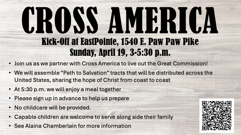 Join EBC for the “Cross America Kick-Off” at EastPointe on Sunday, April 19, from 3:00 to 5:30 p.m. at 1540 E. Paw Paw Pike. We will partner with Cross America to live out the Great Commission as we assemble “Path to Salvation” tracts that will be distributed across the United States, sharing the hope of Christ from coast to coast. At 5:30 p.m., we will enjoy a meal together. Please, -> SIGN-UP here <- in advance to help prepare. Please note that childcare will NOT be provided for this kick-off meeting, though capable children are welcome to serve alongside their families. For more information, please see Alaina Chamberlain.