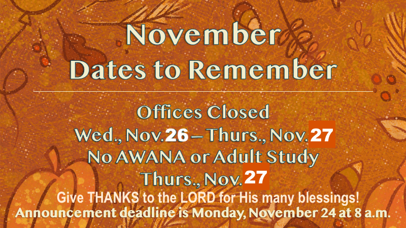 EBC 2025 NOVEMBER “Dates-to-Remember” Date November 22 – 27, 2025 Time Celebrate the LORD’s blessings of Thanksgiving Address 1540 E. Paw Paw Pike Peru IN 46970 Directions Venue EastPointe Bible Church Category Announcement, Special “1 Give thanks to the Lord, for He is good,For His lovingkindness is everlasting.” – Psalm 136:1 NASB1995