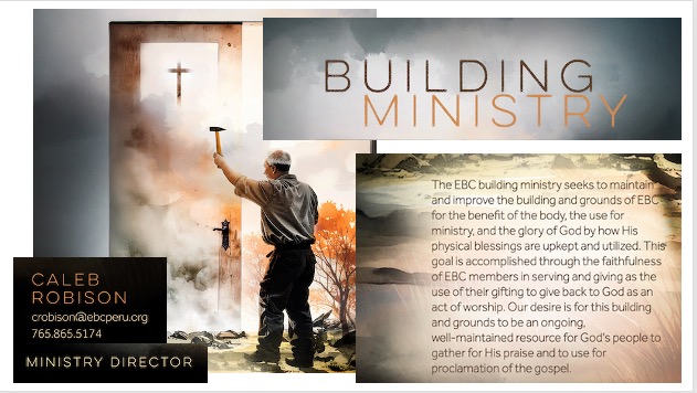 EBC October 2025 MINISTRY Highlight ~ BUILDING Date October 1 – 31, 2025 Every Week Time Building for the Proclamation of the Gospel Address 1540 E. Paw Paw Pike Peru IN 46970 Directions Venue EastPointe Bible Church Category Announcement, Monthly, Special Building, Improving & Serving EastPointe Bible Church, for the proclamation of the Gospel