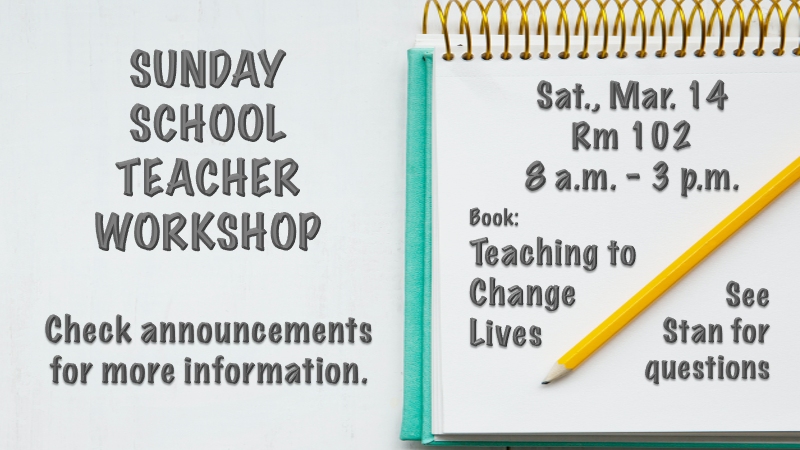 EastPointe Children’s Sunday School teachers are invited to a Learning Workshop with a lunch on Saturday, March 14, 2026, 8:00 a.m. – 3:00 p.m. Contact Stan Horton with your questions.