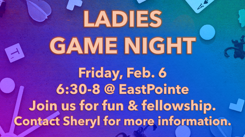 Ladies, you are invited to a night of fun and fellowship on Friday, FEBRUARY 6, 6:30-8:00 p.m. at EastPointe. It’s going to be a fun night of fellowship, games, snacks, and time of testimonies. Write this night in on your calendar, NO SIGN-UP necessary, see you 2-06-2026 at 6:30! If you have questions, contact SHERYL HODSON.