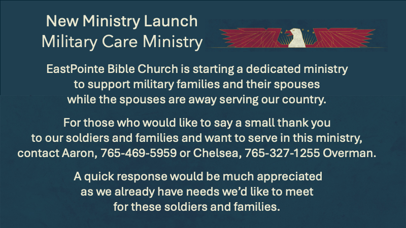 EastPointe Bible Church (EBC) is starting a dedicated ministry to support military families and their spouses while the spouses are away serving in our country’s military. The goal is to provide tangible, Christ-like kindnesses in several key PRACTICAL HELP areas: -> Assisting with yard work, car repairs, child care (when needed), making meals, or home maintenance while the primary “handy-man” is away. -> PRAYER & CARE: Sending regular care packages (when applicable) and maintaining a prayer group who is dedicated to praying for our EBC families while the soldiers are away. This would include having people who are consistently check-in with those deployed soldiers. For those who would like to say a “Thank you” to our soldiers & families and desire to serve in this ministry outreach, contact Aaron, 765-469-5959, or Chelsea, 765-327-1255, Overman.