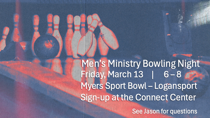 Join EBC Men’s and Boy’s for a night of fun at Myers Sport Bowl in Logansport. Be prepared to pay for shoe rental and game purchase – EBC will have a discounted rate. Snacks, hot dogs, soft drinks available for purchase. (Look for future update if we can bring food into the bowling alley.) No age limit – ALL boys and men welcome. Gutter guards are available for the young bowlers. Sign-up available at EBC’s Connect Center. Contact Jason Winegardner (765) 346-0257 with questions.