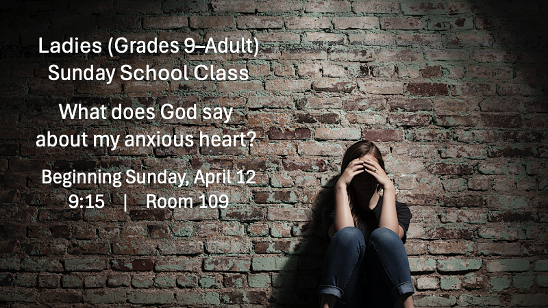 Ladies Sunday School Class – Begins Sunday, April 12, 9:15, Rm 109 -(Grades 9 through Adult)