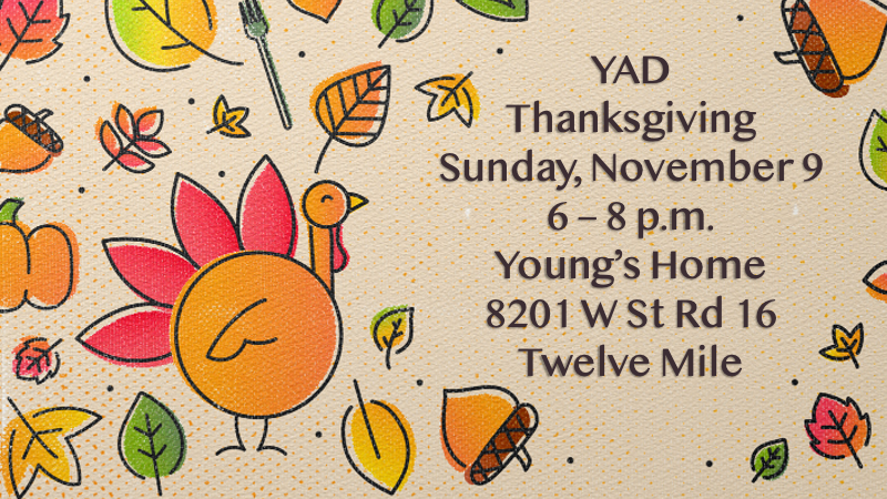 Young Adult Discipleship, Y.A.D.’s – THANKSGIVING Dinner, Sunday, Nov. 9 @ 6:00 p.m. Date November 9, 2025 Every Week Time 6:00 pm – 8:00 pm Young’s house, 8201 E. SR 16, Twelve Mile, IN Address 8201 E State Road 16 Twelve Mile, IN Directions Venue Steve & Missy Young’s Category Announcement, Annual, Special